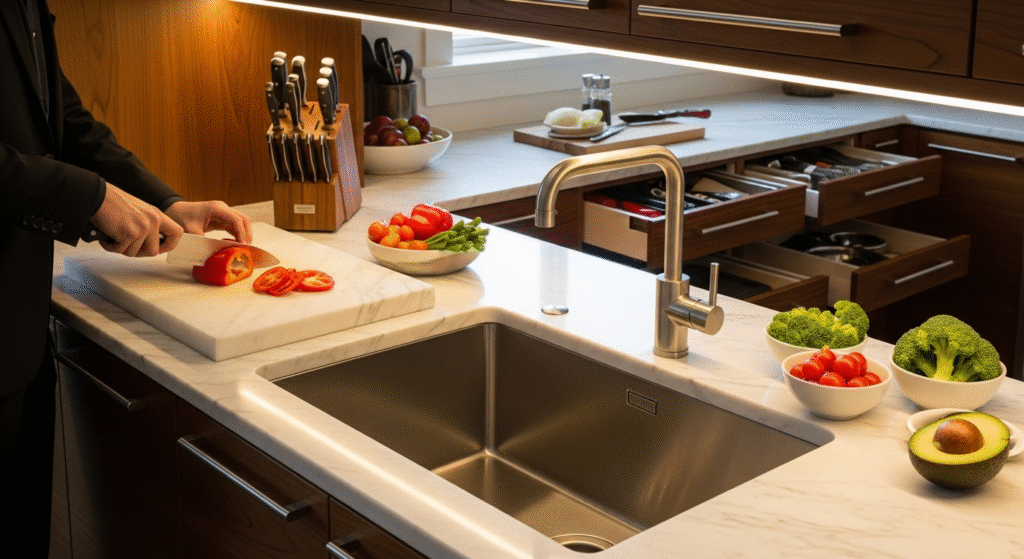 The prep zone concept revolutionizes kitchen remodeling San Francisco Bay Area projects by creating specialized stations equipped with task-specific tools and storage. Vegetable prep areas feature deep sinks, cutting board storage, and compost solutions, while baking zones include marble surfaces, ingredient storage, and specialized tool organization.