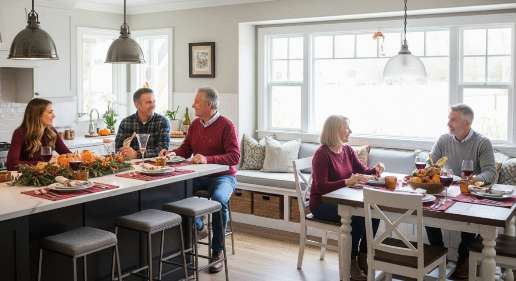 Thanksgiving celebrations require flexible seating solutions that accommodate both casual conversation and formal dining, making strategic seating integration crucial for kitchen remodeling San Francisco Bay Area projects. Professional designers create multiple seating zones that serve different functions throughout holiday entertaining.