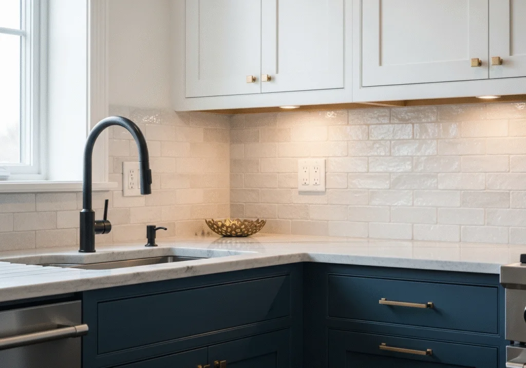 - Textured backsplashes paired with smooth countertops